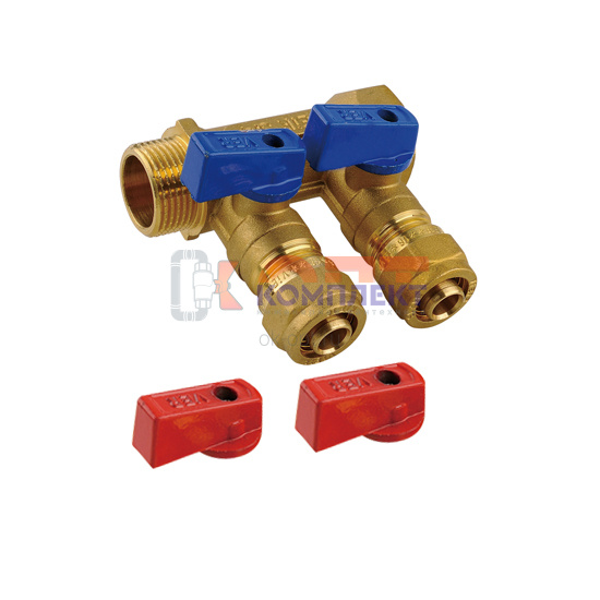 коллектор с отсеч. кранами 1"х16 - 2 вых. красн.+син. латунь VR (40/1шт)