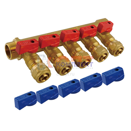 коллектор с отсеч. кранами 1"х16 - 5 вых. красн.+син. латунь VR (40/1шт)