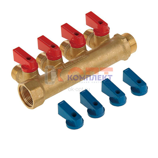 коллектор с отсеч. кранами 1"х16 - 4 вых. красн.+син. латунь VR (40/1шт)