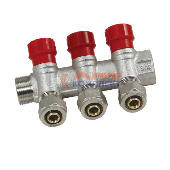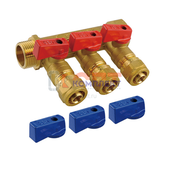 коллектор с отсеч. кранами 1"х20 - 3 вых. красн.+син. латунь VR (40/1шт)