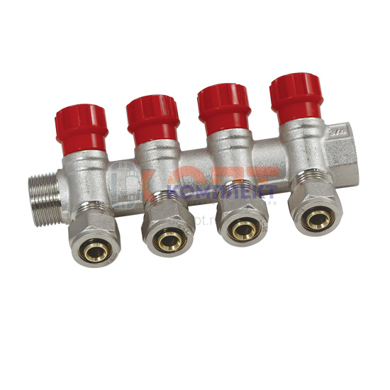 коллектор с отсеч. кранами 1"х20 - 4 вых. красн.+син. латунь VR (40/1шт)