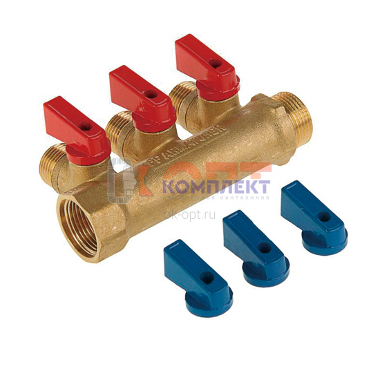 коллектор с отсеч. кранами 1"х16 - 3 вых. красн.+син. латунь VR (40/1шт)