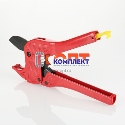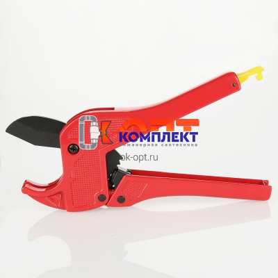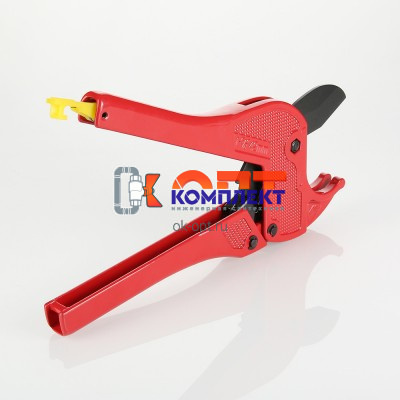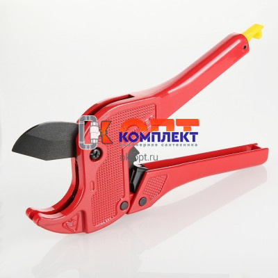 Разрезание пластиковых, металлопластиковых и пластиковых труб – ответственная операция, которую следует производить с применением специального инструмента. Ножницы для труб VALTEC оснащены лезвием из закаленной стали, зубчатым храповым и рычажным открывающим механизмами, фиксирующей защелкой. Перпендикулярный разрез трубы без деформации стенок обеспечивает конфигурация опорной скобы, поступательное движение ножа, поднятие которого происходит при разведении рукояток. Изделие рекомендуются для диаметров до 26 мм.