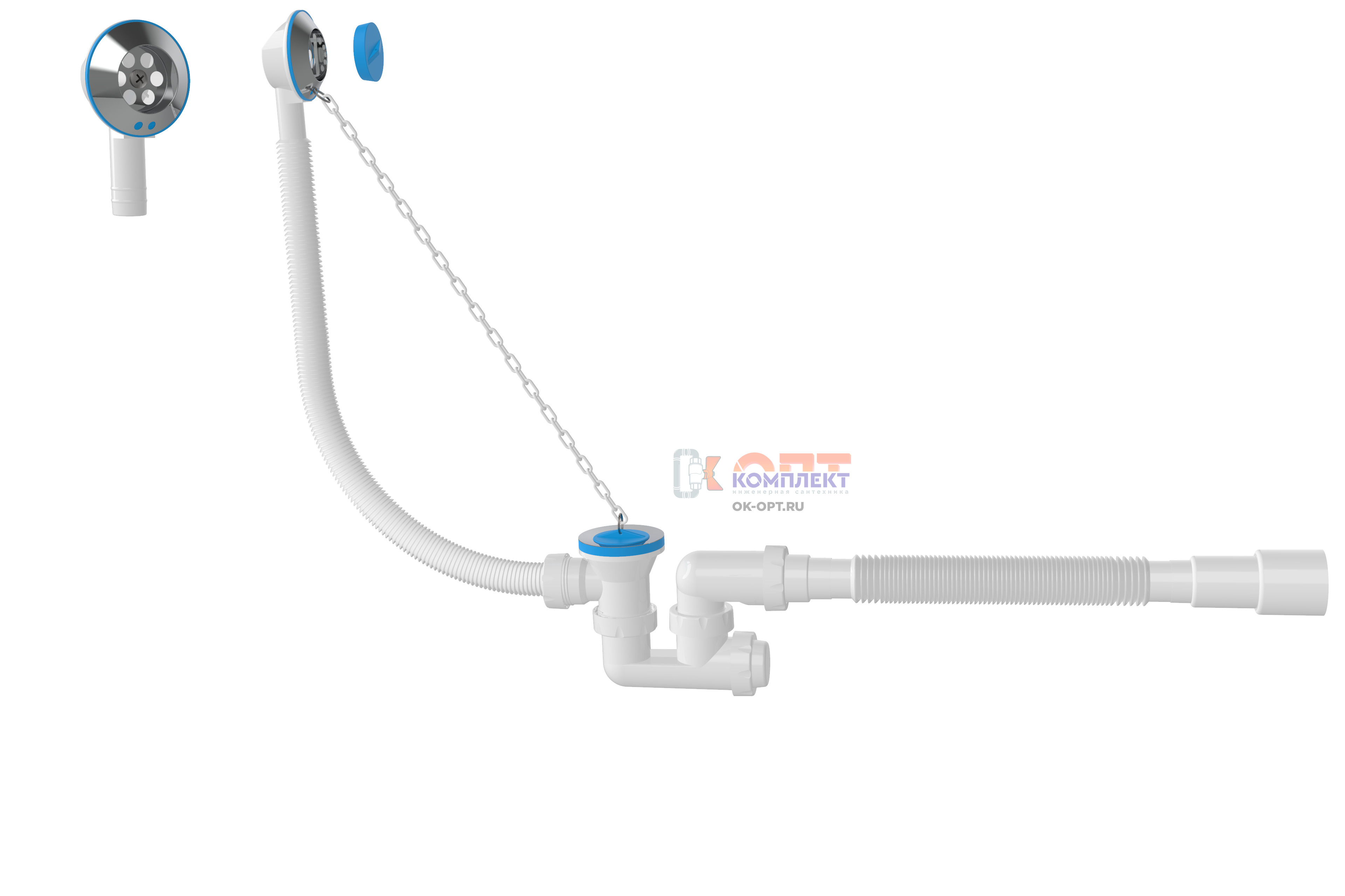 Сифон для ванны F-образный h 120mm, с перев и выпуск 70мм, цеп и проб, г/тр Ø40-Ø40/50 (25шт)