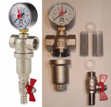 Все большей популярностью в системах квартирного водоснабжения пользуются промывные фильтры. Они позволяют выполнять очистку фильтра без его отключения и разборки. Промывной каскадный фильтр VALTEC VT.389 (рис. 12) оснащен двумя фильтроэлементами из нержавеющей стали (один в другом) с размером ячеек 1000 и 250 мкм, манометром для контроля давления и дренажным краном для промывки.