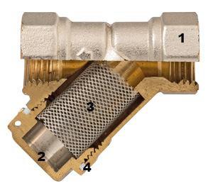 (слева направо): VT.192, VT.191, VT.190. Все модели косых фильтров VALTEC могут использоваться в трубопроводных системах с максимальной температурой рабочей среды до 150 °С. Фильтрующая способность для моделей диаметром до 1" составляет 500 мкм. Фильтр состоит (рис. 3) из корпуса 1 (горячепрессованная никелированная латунь CW617N), латунной пробки 2, фильтроэлемента 3 (нержавеющая сталь AISI 316) и тефлоновой прокладки 4. Пробка фильтра имеет пломбировочное отверстие, необходимое при установке этого элемента перед водосчетчиком. Обслуживание косого ФГО заключается в периодической очистке фильтроэлемента. Для этого необходимо открутить пробку и извлечь фильтроэлемент для очистки и промывки.