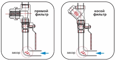 - косой или прямой фильтр устанавливается на вертикальном участке трубопровода при восходящем потоке без устройства горизонтального участка. В этом случае шлам, оседая в нижнем отводе трубопровода может со временем полностью перекрыть трубопровод (рис. 15).