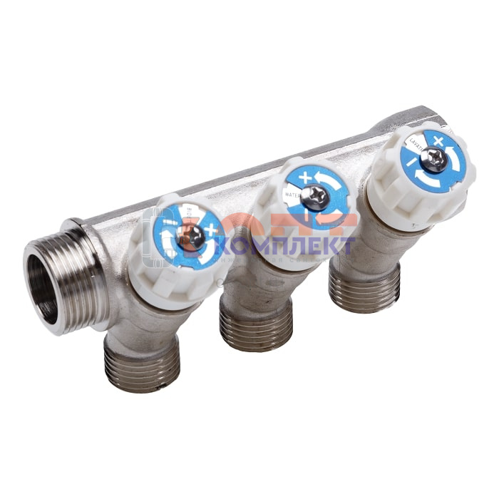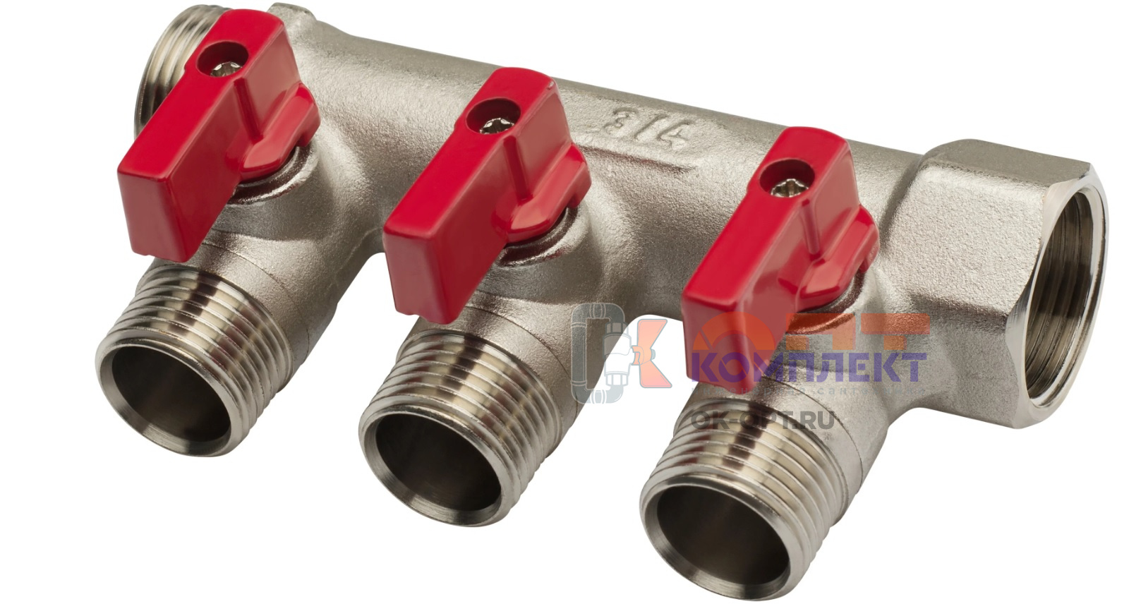 коллектор 3 выхода с отсеч кранами 3/4х1/2 нар. латунь никель (2/20шт)